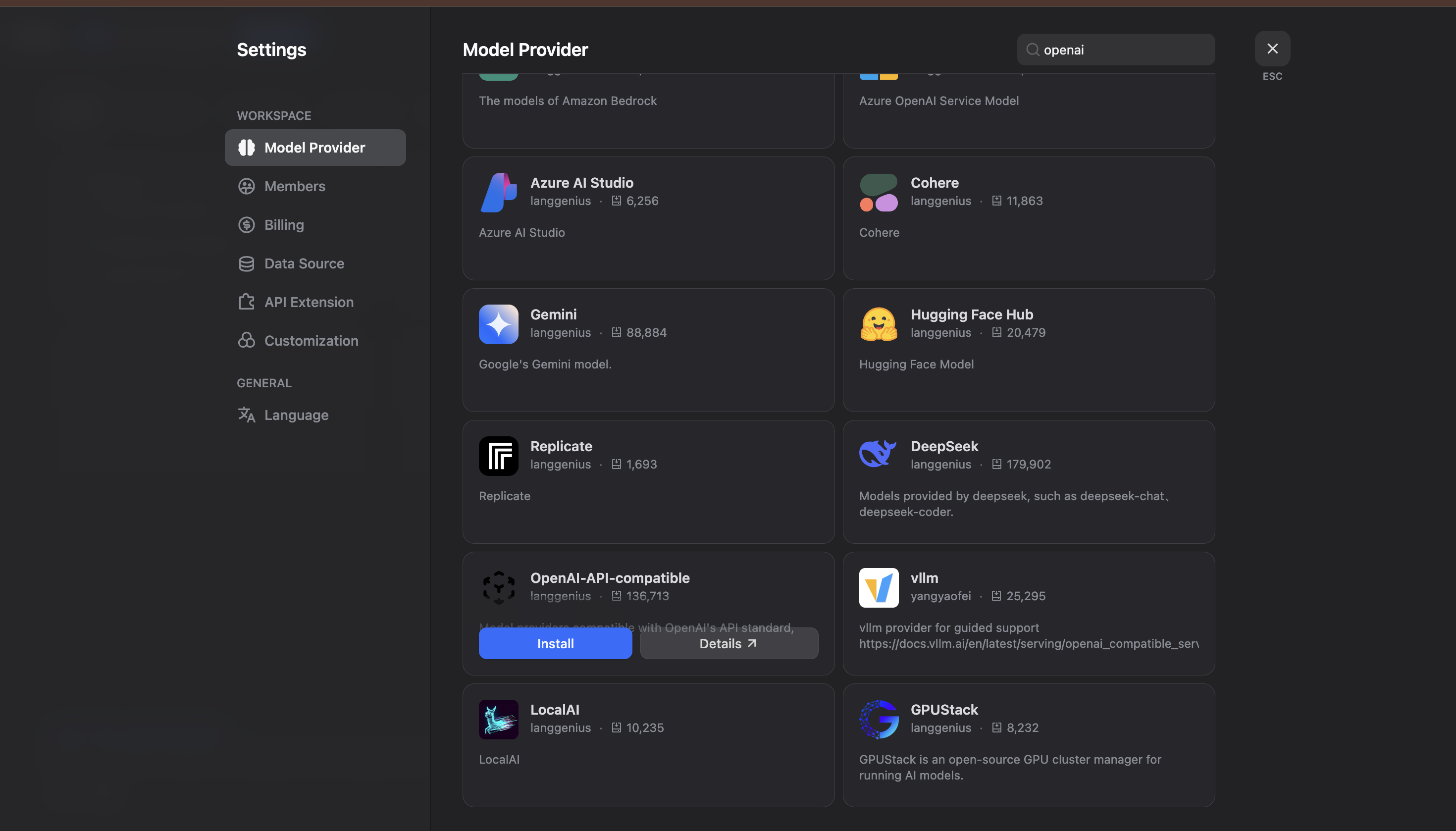 - In the Model Provider section, look for OpenAI-API-compatible and click Install.