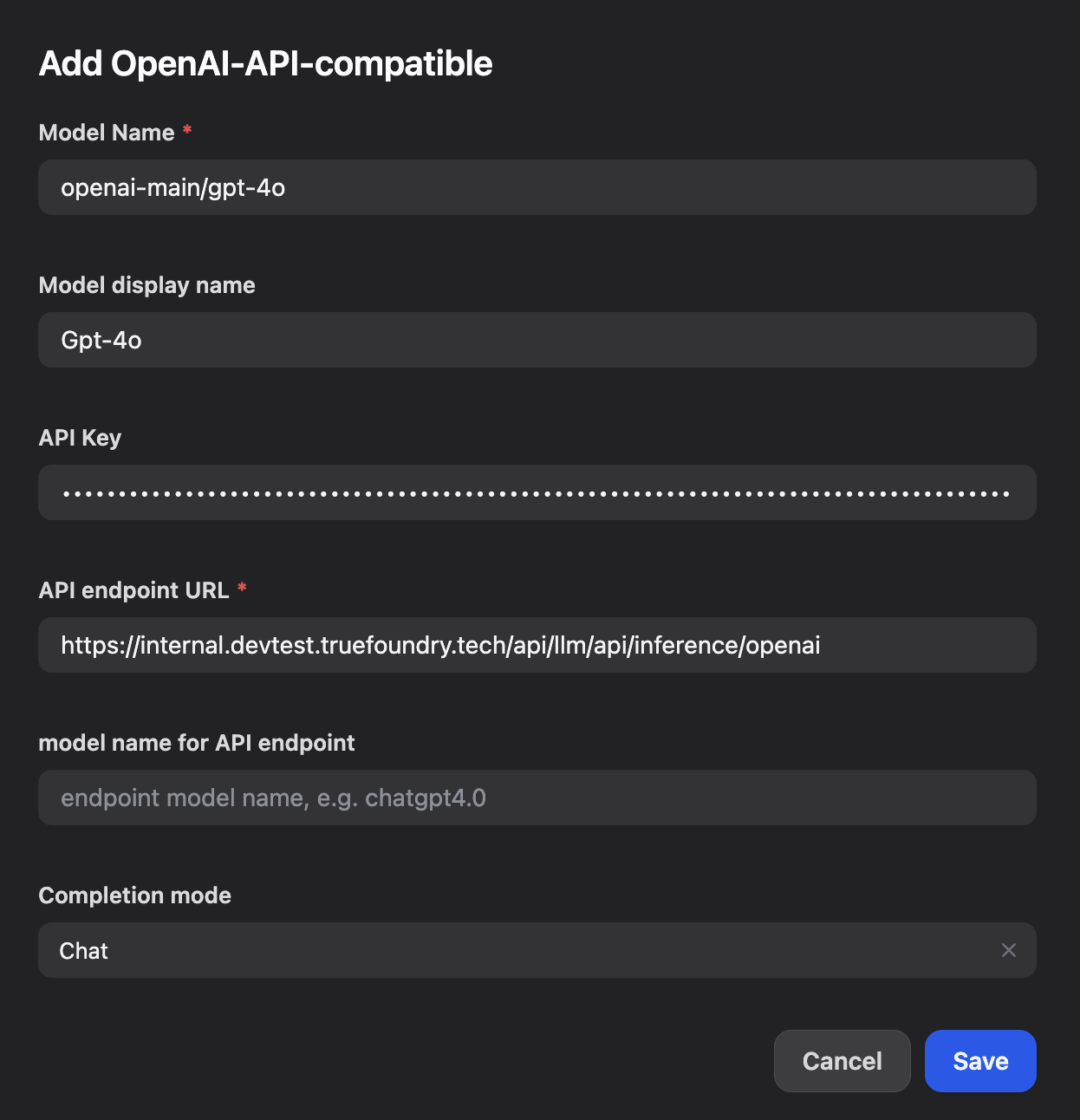 - Configure the OpenAI-API-compatible provider with your TrueFoundry details: